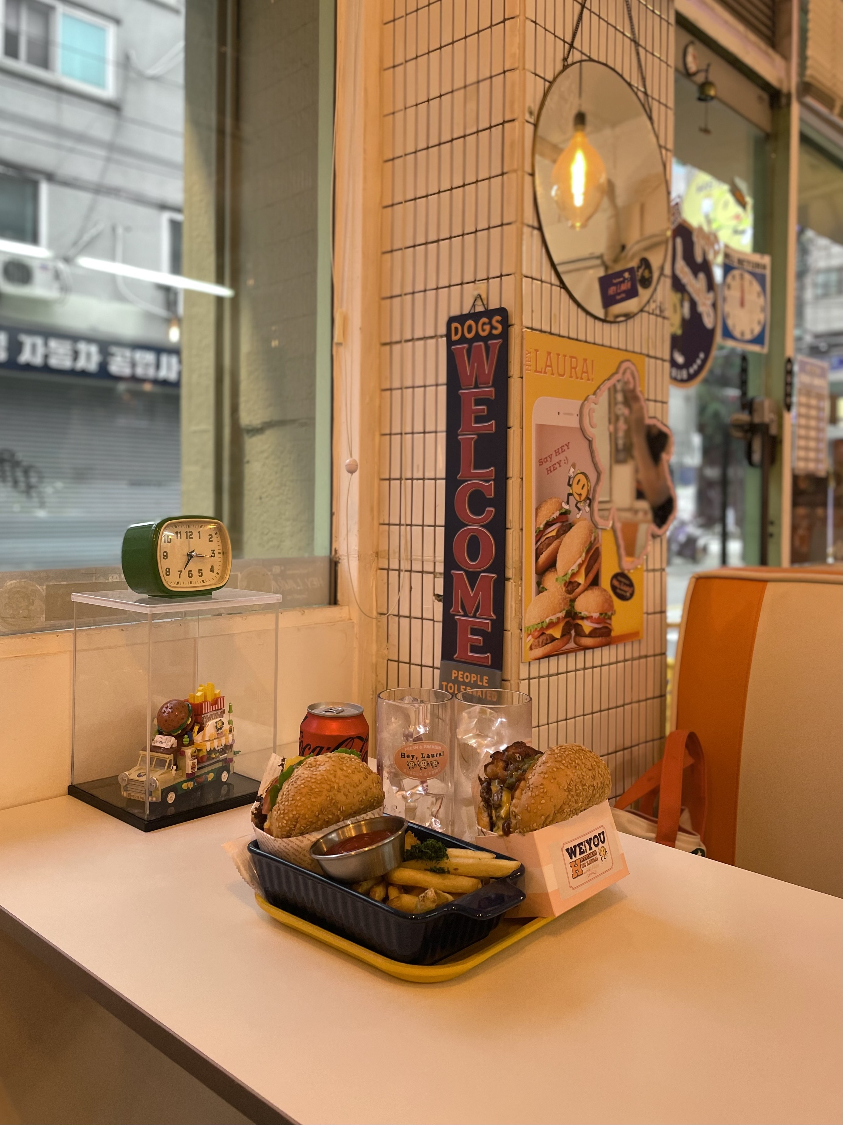 수제버거 집으로 내가 먹은 헤이로라는 개인적으로 할라피뇨 때문에 첫 입은 살짝 매웠음 근데 고기도 두툼하고 더블 페티여서 고기의 느끼함을 잡아주기도 해서 맛있었다 참고로 페티는 수제 페티라고 한다! 그래서 더 맛있는듯